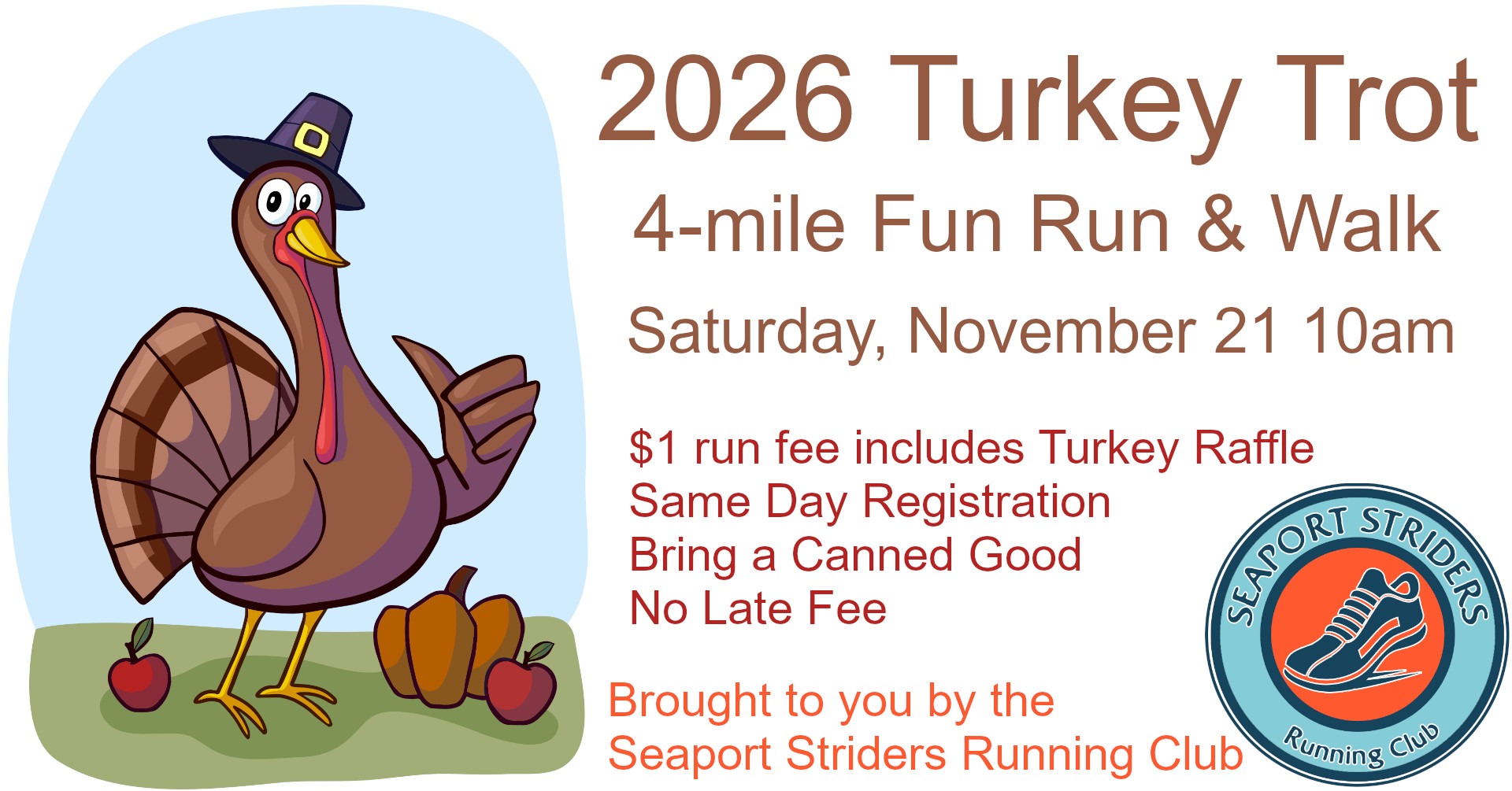 Registration: Check-in and registration from 9:30 a.m. to 10:00 a.m. next to the Swallows Nest Park Boat Launch on Highway 129. For more information, call our race director at TurkeyTrot_run@SeaportStriders.com.